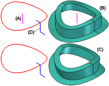 选择锁定轴 (A) 后,横截面轮廓和生成的曲面与垂直于锁定轴方向的平面保持某种固定关系,该轮廓是恒定的 (B)。未指定任何锁定轴时,横截面轮廓和生成的曲面与垂直于路径的平面保持某种固定关系,该轮廓是变化的 (C)。在此示例中,还可以使用横截面轮廓中的竖直线 (D) 来定义锁定轴。路径不能与任何点的锁定轴平行。