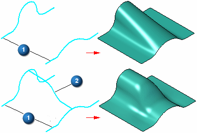 这些草图或边可只代表横截面 (1),也可代表横截面 (1) 和引导曲线 (2)。必须至少定义两个横截面或定义一个横截面和一条引导曲线。