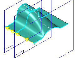 如果使用引导曲线构造蓝面特征,则引导曲线与每个横截面相交并相切连续(该曲线不能有任何尖角)。为确保该引导曲线与横截面相交,应在每个交点处添加连接关系或蓝点。