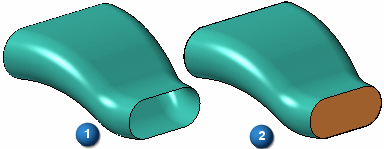 当使用封闭横截面创建蓝面特征时,可以使用蓝面选项对话框上的端部封盖选项来指定特征端保持为开放 (1) 还是封闭 (2)。当设置封闭端部选项时,将创建一个实体构造体。
