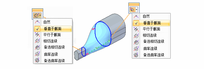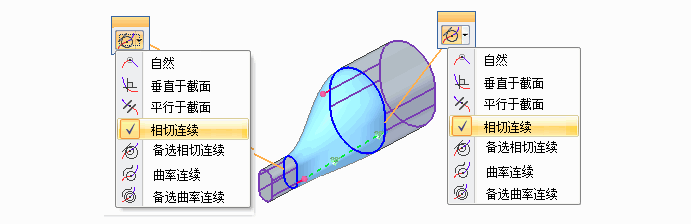 放置和编辑工作流期间会出现屏显图形手柄,以快速更改横截面和引导曲线的相切控件。可以使用蓝面选项对话框上的相切控制选项来定义要用于所生成曲面的端部条件选项。例如,可以指定该曲面与相邻曲面相切。