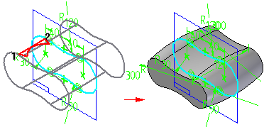 在使用封闭轮廓创建拉伸曲面时,可使用命令条上的开放端部和封闭端部选项来指定曲面的末端是开放的 (1) 还是封闭的 (2)。如果设置了封闭端部选项,将向特征末端添加平面,创建闭合体积。