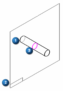 例如,可以将一个圆柱 (1) 与参考平面 (2) 相交。然后,可以使用生成的相交曲线 (3) 作为构造特征或曲面修剪操作中的输入。