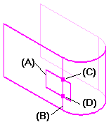 在两组元素相交处创建关联点。例如,您可以使用此命令查找存在于矩形曲线 (A) 和构造曲面的直线边 (B) 之间的交点 (C) 和 (D)。