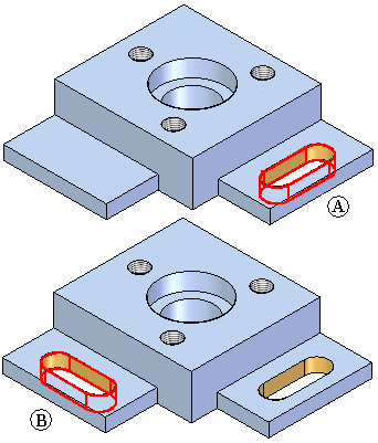 您可以使用 Windows 剪贴板来剪切、复制和粘贴零件和模型元素。例如,您可以复制除料特征 (A),然后将其粘贴到零件 (B) 上的新位置。