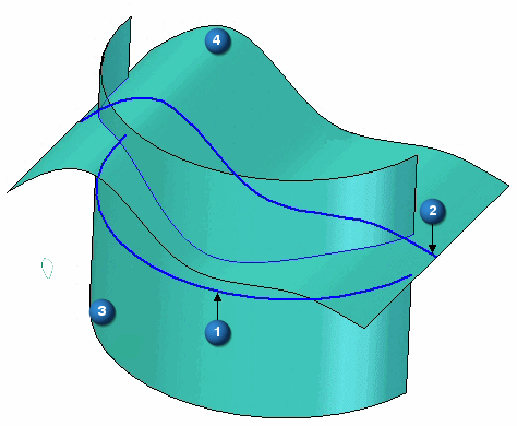 (1) 和 (2) 是输入曲线。(3) 和 (4) 是理论拉伸曲面。(5) 是生成的交叉曲线。
