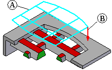 通风口特征的拔模角度是相对于草图和特征的延伸方向来定义的。对于下面的通风口特征,草图 (A) 定位于零件上方,而范围 (B) 定义为向下朝向零件。肋条和翼梁上的红色表面则可看成是外部面,斜角方向定义为朝外,也是添料的方向。