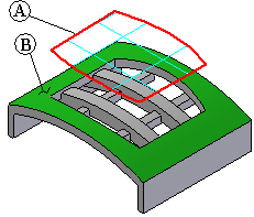 肋条和翼梁的顶部和底部曲面通过偏移边界元素切过的第一个曲面(入口曲面)来构造。例如,所示通风口的边界元素 (A) 切穿半径值为 125 毫米的柱面 (B)。肋板和纵梁的顶部和底部面也将是柱面。