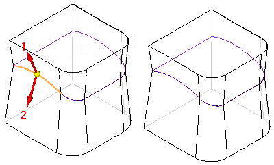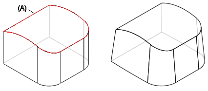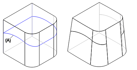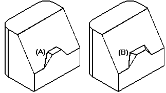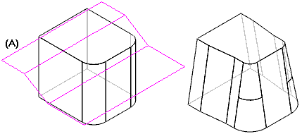 对于垂直选项,将创建垂直于拔模面的阶梯面 (A)。对于锥形选项,创建的阶梯面与拔模面呈锥形 (B)。