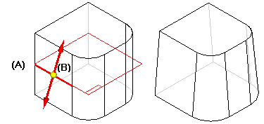 从平面:您可以选择一个参考平面或平的面来作为拔模平面 (A) 使用,然后使用同一平面来定义枢轴位置 (B)。枢轴位置的零件尺寸将保持不变,并且还将添料或除料以构造拔模特征。在此例中,由于拔模平面位于零件的大致中心位置,因此将移除枢轴位置上方的材料,并向枢轴位置下方添料来构造特征。