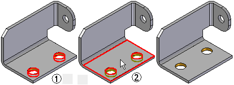 “在平面内”选项允许参照平的面 (2) 将一个或多个面 (1) 移动到新位置。在想要重新定位钣金件上的孔或其他特征时,这非常有用。“在平面内”选项要求使用关键点来定义终点。