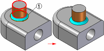 可以使用“自动选择倒圆”选项选择与要移动的面相邻的倒圆 (1)。当要与移动的面保持相切的零件上存在相邻的倒圆或圆角时,此选项很有用。