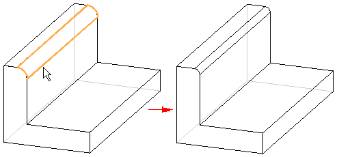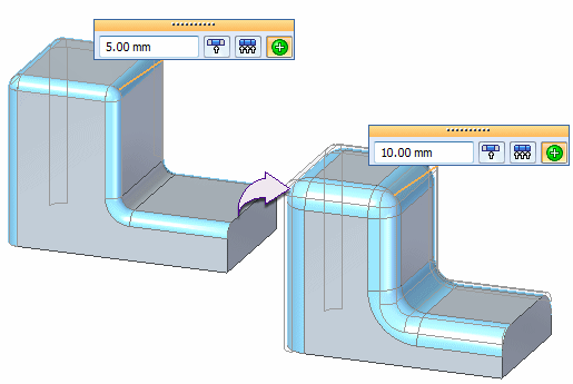编辑同步倒圆时,倒圆轴可以是固定的,或者轴可以随半径值的更改而浮动。可以使用“倒圆编辑行为”选项控制倒圆的编辑行为。在倒圆面上右键单击以显示快捷菜单。