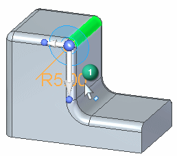 要编辑单个同步倒圆,则选择倒圆,然后单击倒圆值手柄 (1)。在“编辑尺寸值”框内输入一个值,然后按 Enter 键。