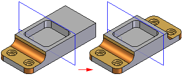 在某些情况下,可以使用智能选项来单独镜像处理特征。例如,可以镜像倒圆特征本身,但是只有与镜像平面以对称方式对齐的现有的边会得到圆化。