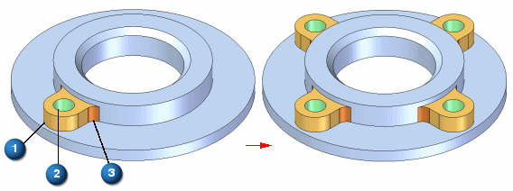 设置零件特征阵列时,阵列的父元素可包含多个零件特征。例如,您可以在一个操作中阵列化基于草图的特征(例如拉伸 (1))、孔 (2) 和加工特征(例如倒圆 (3))。