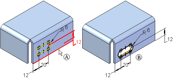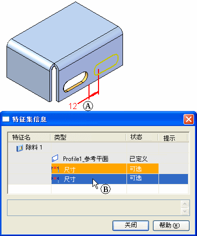 在放置库成员过程中,还可通过不选择某个尺寸的边来避免此问题。例如,可通过单击特征集信息对话框 (B) 中的下一行跳过所显示的 12 毫米尺寸 (A)。