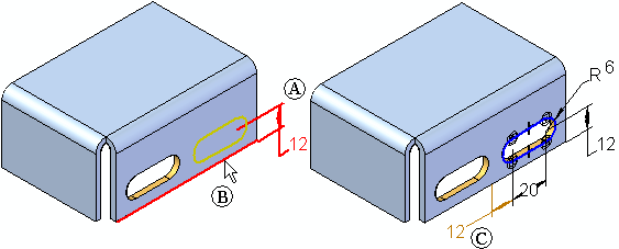 下一个尺寸显示在图形窗口 (A) 中。在这个示例中,可以选择相同的边 (B) 作为第一个成员。轮廓和特征放置在面上,被跳过的尺寸显示为失败的颜色 (C),表示它需要定义外部边。然后可关闭对话框,并编辑此特征以定义尺寸边并编辑其值。