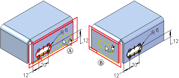 放置库成员后,可以使用命令条上的重复按钮放置其他副本。可将副本放置在同一面 (A) 上,也可以将副本放置在不同面 (B) 上。