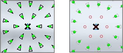 默认设置为“使用事例痕迹 (A)”方法。此设置使用阵列对象的痕迹(2D 轮廓)以确定对象是否在填充区域内。“允许边界接触 (B)”选项控制是否对痕迹接触填充边界的事例进行抑制。 要使用“事例标记器”方法,请关闭“使用事例痕迹 (A)”。事例标记器方法使用事例轮廓质心确定事例是否接触边界。 |