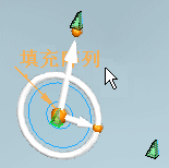 下图显示了中心定向为开启的方向盘显示。方向盘的环面上将显示一个把手,环面中有一个箭头。选择把手或箭头,更改事例的方位。