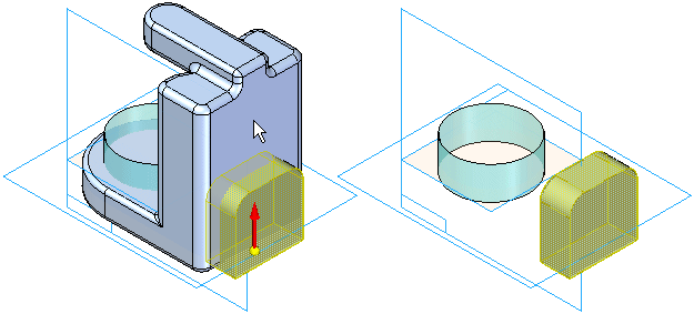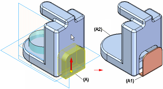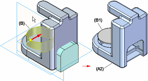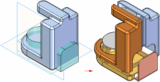 分割零件的第一步是选择用于定义分割位置的参考平面或构造曲面。动态箭头 (A) 允许定义剪切方向。在定义剪切方向之后,屏幕会更改,以显示剪切操作的结果 (B)。