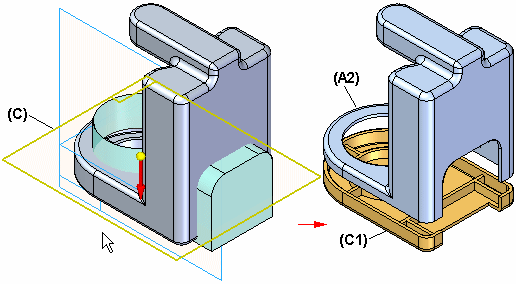 构造曲面 C 用于创建零件 C1 并修改零件 A2(不能再次剪切零件 C1)。