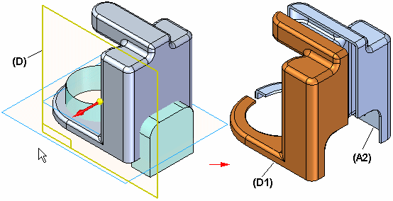 参考平面 D 用于创建零件 D1 并修改零件 A2(不能再次剪切零件 D1)。