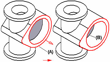 通过选择要偏置的面来构造加厚特征,然后相对于所选面定位光标来指定偏置方向。当添加某个加厚特征到实体模型时,将会修改与正在加厚的面相邻的面,但其他面不受影响。例如,当加厚平面 (A) 时,会延伸与已加厚面接触的面,但位于切块底部的面 (B) 保持原始位置。