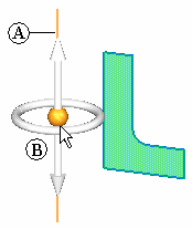 将光标定位在要用作旋转轴的草图元素 (A) 或模型边上,然后单击以将旋转手柄 (B) 放在草图元素或模型边上。
