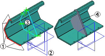 您可随后使用该零件副本更方便地设计新部件。例如,可使用投影到草图命令将边 (1) 以关联方式复制到轮廓平面 (2) 上,从而在新零件上创建基本特征 (4) 的轮廓 (3)。您还可以向轮廓中添加新的元素,并通过在适当位置的修剪来修改以关联方式包含的元素,从而创建满足基本特征的封闭轮廓。