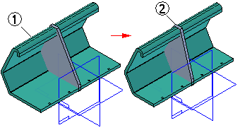 随后可打开使用了关联零件副本 (1) 的零件。您可以更新零件副本,此时零件中的关联几何体 (2) 将更新。