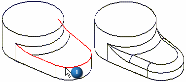 如果颠倒了这两个倒圆特征的次序,并选择边 (2) 作为第一个倒圆特征,则应用此倒圆时边 (1) 的末端就会被修改。