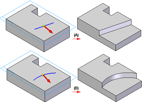 当您使用末端开放的草图构造特征时,草图两端向与现有模型的相交处延伸。直线以线性方式延伸 (A);圆弧沿圆周延伸 (B)。材料在选定方向上沿着整个延伸草图被添加或移除。
