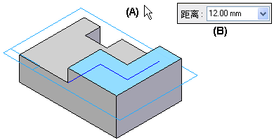 范围步骤 - 定义要添料的范围,方法是使用光标 (A) 或者在命令条 (B) 中键入值。还可以使用另一个特征上的关键点或装配中的另一个零件来定义特征的范围。有关详细信息,请参见区段中,使用关键点定义范围。