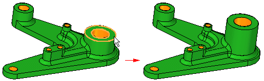 如果模型的一侧有多个相切面,则会将它们全部选中作为一个面,不能个别地选择它们。