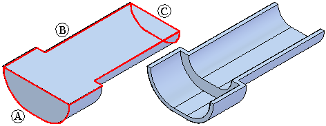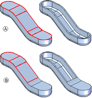 开放面步骤 - 选择所有要保留开放的面。开放面没有偏置,被从实体中移除。例如,如果指定面 (A) 应该是开放的,则会移除该面并创建薄壁特征。