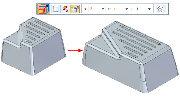 缩放体命令同时支持等比缩放(在所有方向等比应用比例因子)和非等比缩放(比例因子可单独应用到 X、 Y 或 Z 方向)。缩放出现在基本坐标系上,除非选择一个关键点。