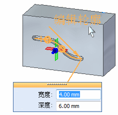 随即显示槽命令条、动态编辑框、特征原点和特征轮廓编辑手柄。