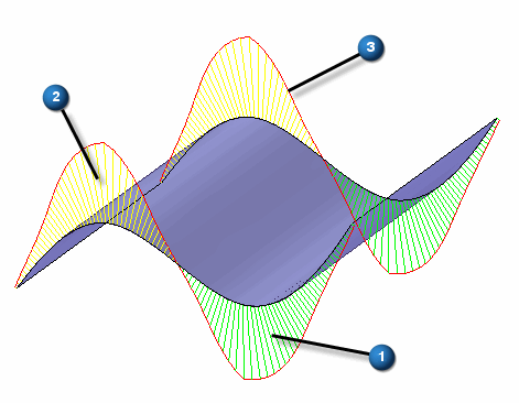 下图展示了曲率梳的颜色。标记为 1 的项是“方向 1 颜色 1”(曲线下方的颜色)。标记为 2 的项是“方向 1 颜色 2”(曲线上方的颜色)。标记为 3 的项是梳曲线颜色。