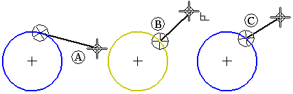 例如,绘制与圆相连的直线时,可以利用意向区绘制以下直线:与圆相切 (A)、与圆垂直 (B) 或其他角度 (C)。