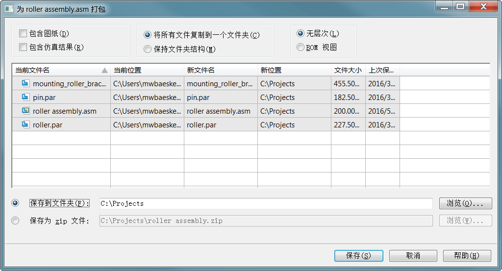 如果选择这些选项之一,系统会将所有相关图纸或仿真结果复制到您指定的文件夹位置或 zip 文件。