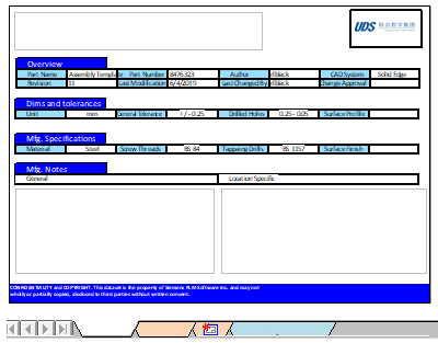 图纸 1 图纸布局 - 将第一张图纸设为封面图纸。添加标题以标识每部分的信息,如概述、尺寸和公差、制造规范和制造说明(常规、特定于位置)。