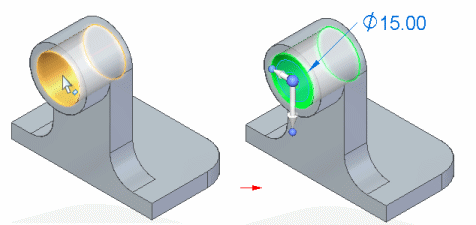 例如,单击孔特征时,会显示 2D 方向盘手柄 (A) 以及编辑定义手柄 (B)。