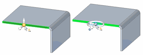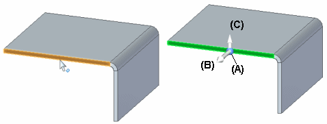 例如,单击钣金件上的平厚面时,仅显示 2D 方向盘上的原点把手 (A) 和主轴 (B)。此外,会显示弯边起始手柄 (C)。