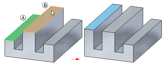 示例:可使用“重合”选项来指定种子面 (A) 与在模型上所选择的目标面 (B) 重合(共面)。