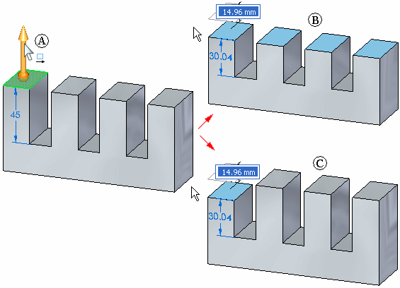 示例:如果保留共面设计意图,在移动选定面时,未选定的共面面会保持共面 (B)。清除设计意图面板上的“共面”选项后,共面的未选定面在移动选定面时保持静止 (C)。