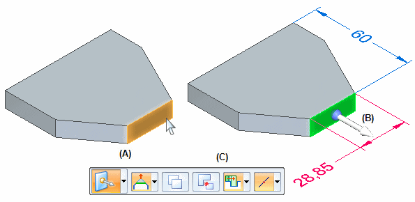 然后可单击方向盘上的主轴箭头 (A) 以移动选定面 (B)。相邻面自动更新。