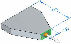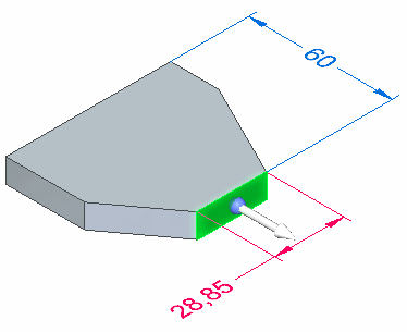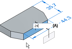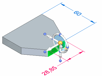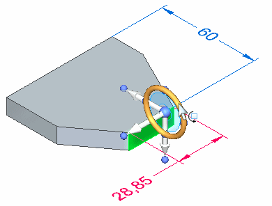 此时会显示方向盘手柄 (A) 的轴和原点。还将显示所有附着于该面的尺寸。