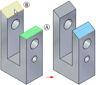 修改一个或多个选定面的位置和方向,从而使它们与零件上的某个目标面有平行关系。可使用命令条上的选项来指定要如何使选定面与目标面几何相关。